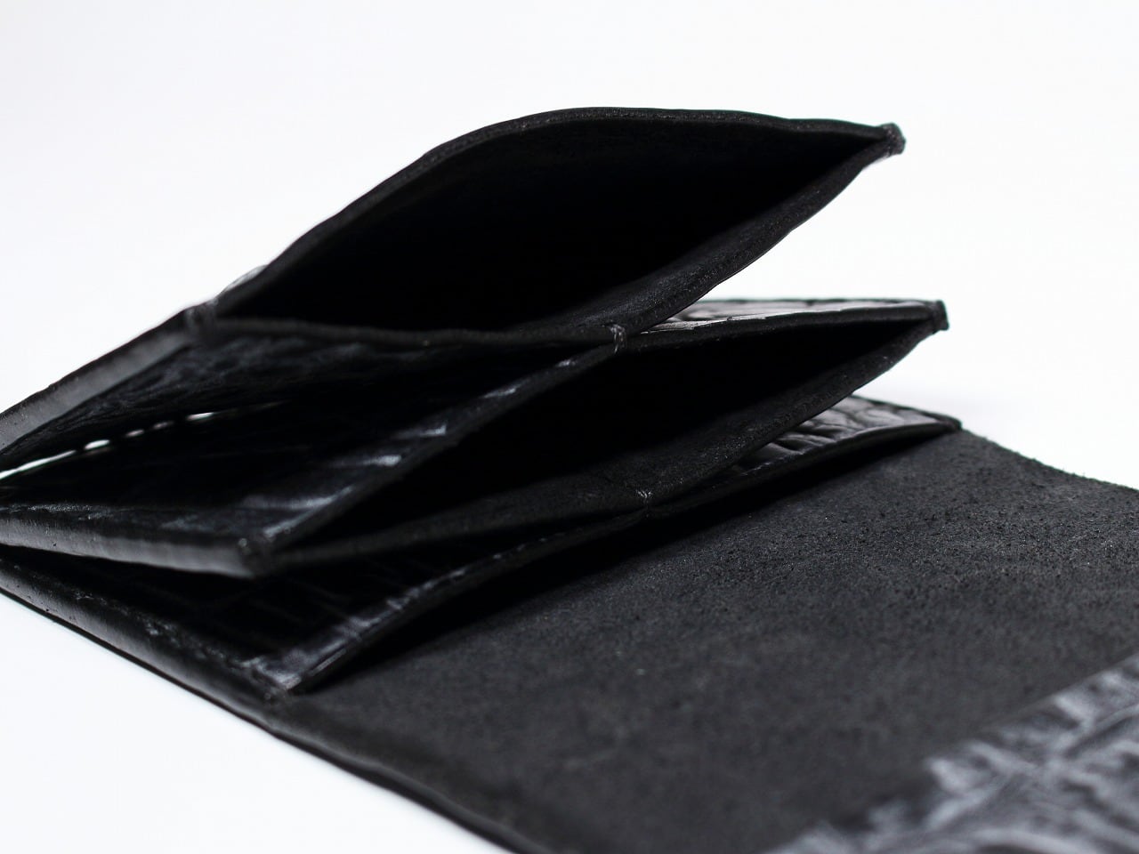 かなり硬めな約2mm厚クロコ型押しのヌメ牛革で製作。